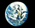 During 1969, peace activist John McConnell proposed his design titled the Earth Flag. The current version of the flag consists of The Blue Marble, a photograph of Earth taken on 7 December 1972 by the crew of the Apollo 17 on its way to the Moon. The planet is placed on the dark blue background. Prior to 1973, the flag design used photograph no. 69HC487, taken by the crew of the Apollo 10 on 18 May 1969. The early flag versions also had more simplified designs, depicting white outlines of the clouds, on the light blue circle, instead of more detailed photograph of the planet.[2][3]