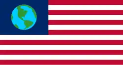 In the 1999 Futurama science fiction comedy television series, set in the 3000s, the Earth is united under a world government. Its flag contains thirteen horizontal stripes, alternating between red and white, with a blue canton in the left top corner, containing a globe, with the Americas prominently depicted in the centre. It was based on the flag of the United States. Its aspect ratio of the height of the flag to its width equals 10:19. The flag appeared for the first time in the episode "When Aliens Attack", and was prominently featured in the episode "A Taste of Freedom", where it was named the "Old Freebie".[49][50]