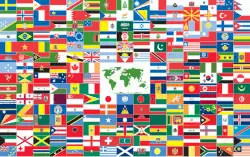 In 1988, Paul Carroll proposed a design titled The World Flag, that combined the flags of 159 member states of the United Nations. It was created to promote the global unity and cooperation. The flag depicted the national flags placed next to each other. In the centre of the flag was placed a Dymaxion map of the world. The design was updated in the 1992, expanding number of flags included to the total of 230, adding all national flags used at the time, and additionally including the flag of the United Nations, and flags of the various self-governed depended territories. The flag was again updated in 2006, 2008, and 2011, to accommodate for the changes of the national flags and political events. Through the redesigns, the map in the centre of the flag was also changed.[7][8]