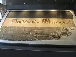 After the fall of the Berlin Wall in November 1989, many East Germans removed the coat of arms from their flags to imply the plain black-red-gold tricolour symbolic of a united Germany.[61] The widespread act of removing the coat of arms from the East German flag implied the plain black-red-gold tricolour as symbol for a united and democratic Germany. Finally, on 3 October 1990, as the area of the German Democratic Republic was absorbed into the Federal Republic of Germany, the black-red-gold tricolour became the flag of a reunified Germany. In 1998, the Foundation for the Reappraisal of the SED Dictatorship was formed. The duty of this organisation, directly responsible to the federal government, is to examine the consequences of the former East German regime. As its logo, the foundation used an East German flag with the Communist coat of arms cut out.[62]