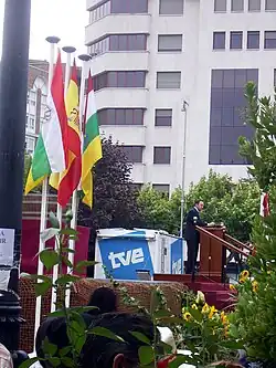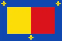 In addition, and similar to the Flag of Spain, a coat of arms can be featured in the center of the flag, specifically the coat of arms of La Rioja.[2] Its use is mandatory for official bodies and entities. It is considered, along with the coat of arms of La Rioja and La Rioja's anthem, one of the “symbols of Riojan identity.”