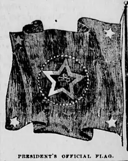 The flag was first used by Arthur on a trip to Florida in 1883.[14] It was used primarily aboard boats, such as on the presidential yacht USS Dolphin in 1893 for a naval fleet review during celebrations related to the 400th anniversary of Columbus.[16] There were some exceptions though, such as during the centennial of Washington's inauguration in 1889,[17] and by a hotel proprietor during a presidential trip to New York City in 1897.[7][8]