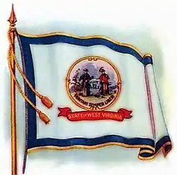 In January 1864, the West Virginia Legislature approved a flag for the Fourth Regiment West Virginia Volunteer Infantry to acknowledge the regiment's battles at Charleston, Vicksburg, Jackson, and Missionary Ridge, all four of which were listed on the flag.[9] This was the first among many battle flags to represent West Virginia after statehood which were utilized by soldiers of West Virginia regiments throughout the war.[5] State battle flags were presented to each of West Virginia's Union regiments during the course of the war.[5] These early state flags were squares of silk cloth measuring 6 feet (1.8 m), and were dark blue and trimmed with golden fringe.[5] The obverse side of these flags were painted with the state's newly minted seal within an oval, along with the name of the respective West Virginia regiment and the names and dates of the battles in which they had participated.[5] On the reverse side, the United States national emblem was painted and consisted of a bald eagle with its wings outstretched, clutching a bundle of 13 arrows in its right talon and an olive branch in its left, and a tricolor shield placed across its breast.[5] In its beak, the eagle clutched a scroll with the national Latin motto E pluribus unum (English: "Out of Many, One").[5] Following the conclusion of the American Civil War, the state of West Virginia had no official flag, and the matter was not taken up until the early 20th century.[5]