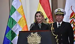 During the government of Jeanine Áñez the flag was used next to the two flags of state institutions in Palacio Quemado and those in official acts with a new and exclusive design.[12][13][14][15]