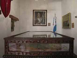 The flags from Macha is the name given to a pair of flags of Argentina found at a chapel in the hamlet of Titiri, near the village of Macha, north of Potosí, Bolivia. They are considered to be the first physical flags created by Manuel Belgrano,[1] who in November 1813 hid the standards to prevent them from falling into enemy hands after the United Provinces' army defeat of Ayohuma. They were discovered in 1885. Bolivia kept one of those flags at Sucre; the other was given to Argentina in 1896 and is currently kept at the National Historical Museum. Tucumán Province has used it as provincial flag since 2010. The flag preserved in Argentina is a triband of blue, white and blue bands, like the modern flag of Argentina, but the one kept in Bolivia is a triband of white, blue and white.