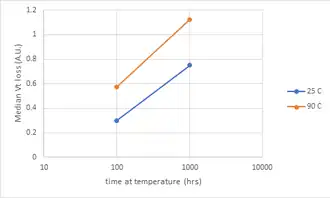 Data stored on flash cells is steadily lost due to electron detrapping. The rate of loss increases exponentially as the absolute temperature increases. For example: For a 45 nm NOR flash, at 1000 hours, the threshold voltage (Vt) loss at 25°C is about half that at 90°C.[99]