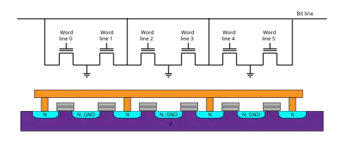 In NOR flash, each cell has one end connected directly to ground, and the other end connected directly to a bit line. This arrangement is called "NOR flash" because it acts like a NOR gate – if any of the word lines (connected to the CG of the cells) is brought high, the corresponding storage transistor may act to pull the output bit line low, but this depends on the charge in the floating gate. Since several words are connected by the bit line, the output does not depend on only two (the bitline staying high if neither the first NOR the second wordline is high) but on all (the bitline remaining high if NONE of the wordlines is high). So to read a bit of a certain word, all the wordlines except that of the desired word are put low.