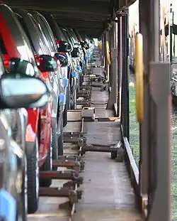 Because cars are a relatively light form of freight, European car transporters have two decks and, despite their great length, only need at most three axles. Where there are three axles, the centre one rests on a swivel and the wagon has an articulated joint in the middle. The cars can be loaded over the joint. These wagons are open as a rule and are thus classified as flat wagons of Class L (see above).
