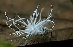 Flatidae are a family of fulgoroid planthoppers.[1] They are cosmopolitan in distribution and are distinguished from others in the superfamily by a combination of characters. Like all other planthoppers, they suck phloem sap of plants. Some species are known to communicate with vibrations through the plant stems.[2] Communication may be with mates, or with ants that tend the nymphs, protecting them and gathering honeydew secretions.[3] Adults of some species have brightly coloured forewings which are tougher and known as tegmina unlike the membranous hindwings which are used for flight. Although a few can be identified by their coloration, most species requires dissection and examination under a microscope with access to literature on already described species.[4]