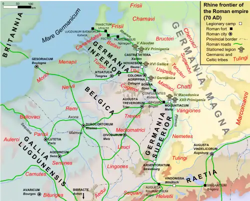 The military campaigns undertaken during Domitian's reign were usually defensive in nature, as the Emperor rejected the idea of expansionist warfare.[83] His most significant military contribution was the development of the Limes Germanicus, which encompassed a vast network of roads, forts and watchtowers constructed along the Rhine river to defend the Empire.[84] Nevertheless, several important wars were fought in Gaul, against the Chatti, and across the Danube frontier against the Suebi, the Sarmatians, and the Dacians. Led by King Decebalus, the Dacians invaded the province of Moesia around 84 or 85, wreaking considerable havoc and killing the Moesian governor, Oppius Sabinus.[85] Domitian immediately launched a counteroffensive, which resulted in the destruction of a legion during an ill-fated expedition into Dacia. Their commander, Cornelius Fuscus, was killed, and the battle standard of the Praetorian Guard lost.[86] In 87, the Romans invaded Dacia once more, this time under command of Tettius Julianus, and finally managed to defeat Decebalus late in 88, at the same site where Fuscus had previously been killed.[87] An attack on Dacia's capital was abandoned, however, when a crisis arose on the German frontier, forcing Domitian to sign a peace treaty with Decebalus which was severely criticized by contemporary authors.[88] For the remainder of Domitian's reign Dacia remained a relatively peaceful client kingdom, but Decebalus used the Roman money to fortify his defenses, and continued to defy Rome. It was not until the reign of Trajan, in 106, that a decisive victory against Decebalus was procured. Again, the Roman army sustained heavy losses, but Trajan succeeded in capturing Sarmizegetusa and, importantly, annexed the gold and silver mines of Dacia.[89]
