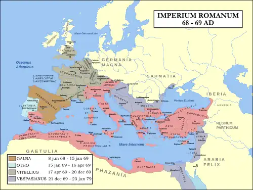On 9 June 68, amidst the growing opposition of the Senate and the army, Nero committed suicide, and with him the Julio-Claudian dynasty came to an end. Chaos ensued, leading to a year of brutal civil war known as the Year of the Four Emperors, during which the four most influential generals in the Roman Empire—Galba, Otho, Vitellius and Vespasian—successively vied for the imperial power. News of Nero's death reached Vespasian as he was preparing to besiege the city of Jerusalem. Almost simultaneously the Senate had declared Galba, then governor of Hispania Tarraconensis (modern Spain), as Emperor of Rome. Rather than continue his campaign, Vespasian decided to await further orders and send Titus to greet the new Emperor.[22] Before reaching Italy, however, Titus learnt that Galba had been murdered and replaced by Otho, the governor of Lusitania (modern Portugal). At the same time, Vitellius and his armies in Germania had risen in revolt, and prepared to march on Rome, intent on overthrowing Otho. Not wanting to risk being taken hostage by one side or the other, Titus abandoned the journey to Rome and rejoined his father in Judaea.[23]