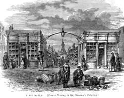 To the north of the market, vegetables were sold in an open-air market. The centre was marked by a clock tower; and the south was adjacent to the Fleet Prison.