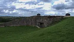 Closest to the enemy are several lines of anti-tank obstacles and minefields. Usually it means a V or U-trench and a wall or dragon's teeth row, while moats, hedgehogs and berms have been used very rarely because they are difficult to be camouflaged. Behind this lies an extensive, at least 30-meter-wide anti-infantry entanglement, which is a mixed system of apron fences, wire concertinas, electric fences, traps, mines, nail spikes and spike pits. Both elements are well camouflaged by good location (relief) and by plants (e.g. small height bushes in front of ditches).[1][7]
