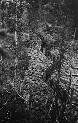 150–300 meters away (effective firing range of machine guns) from the barrier have been built 2 or 3 rings or meandering lines of zigzagging trenches that are adapted terrain and natural objects (e.g. rocks and humps) at every point. Many individual opened fire positions are on both sides of trenches, which allows firing in all directions since the enemy can bypass obstacles (all round defence). Every fortified point have a few heavy weapons, mainly not too many machine guns, medium mortars and a few anti-tank guns are typical. This operated by a company or a battalion sized force and each section have an own shelter. Machine gun and gun pillboxes are firing almost only enfilade direction, they usually protect obstacles from pioneers or guard the rear side of fortified point against flanking operations.[7][2][8]