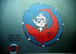 Fliegerstaffel 21 was a Swiss Air Force squadron equipped with Hawker Hunter aircraft at the dissolution in 1994. Their home base was at the Raron Military Airfield. As a coat of arms, Fliegerstaffel 21 carried a white beaver, firing two guns while riding a red shark. On the shark is the black digit 21.