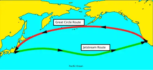 The actual flight length is the length of the track flown across the ground in practice, which is usually longer than the ideal great-circle and is influenced by a number of factors such as the need to avoid bad weather, wind direction and speed, fuel economy, navigational restrictions and other requirements. In the example, easterly flights from Japan to North America are shown taking a longer, more southerly, route than the shorter great-circle; this is to take advantage of the favourable jet stream, a fast high-altitude tail-wind that assists the aircraft along its ground track saving more time or fuel than the geographically shortest route.