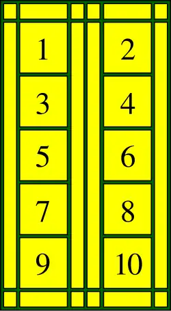 In the 1320s, the powerful guild that had the patronage of the Baptistery, the Arte di Calimala, determined to embellish it with a set of doors for the south portal, through which parents bearing infants for baptism are believed to have entered.[41] By 1329 they settled on a highly ambitious plan inspired by then-still-unrivaled doors for Pisa Cathedral made by Bonanno Pisano 150 years earlier. Andrea Pisano made wax models for bronze reliefs that were executed by Venetian masters, which he then gilded. The year in which they were begun, 1330, appears above the doors, but they took six years to complete. The historian Giovanni Villani was trusted with oversight of the project, as he later recalled proudly.[42]