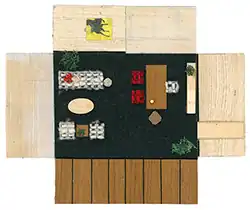 One of Knoll's main challenges was convincing executives and the public to adopt a modernist aesthetic. Knoll Showrooms played a key role in selling the public on modernist design, but Knoll was also gifted at convincing executives to hire Knoll to transform their offices. Knoll was renowned for how she communicated and presented the designs of the Knoll Planning Unit through what she referred to as "paste-ups".[5][16] A "paste-up" was a general graphic-arts term for any draft or finished mechanical flat art, traditionally using an adhesive commonly used in fashion and set design. Knoll was the first to use the method for interior design presentation. Her paste-ups were small representational plans of the space with fabric swatches, wood chips and finishes attached to represent furniture and other details.[4] Knoll used the paste-ups to convey the feeling and experience of the space, in the pictured example the color and texture of the materials used better represented the humanized modernism that was essential to Knoll's designs.[4] The paste-ups were essential in overcoming resistance to change, they gave executives something they could identify with, making them feel comfortable in adopting Knoll's new aesthetics.[5]