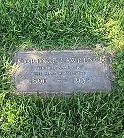 Lawrence's death was ruled a "probable suicide" owing to her "ill health".[23] The Motion Picture & Television Fund paid for Lawrence's funeral, held on December 30, and for her unmarked grave in the Hollywood Cemetery (now Hollywood Forever Cemetery) in Hollywood. Her grave remained unmarked until 1991, when an anonymous British actor paid for a memorial marker for her.[23][25][A] It reads: "The Biograph Girl/The First Movie Star".[23] The date of birth on Lawrence's headstone is given as 1890.[27] This inaccuracy was also stated on her death certificate filled out by the coroner. Lawrence's biographer, Kelly R. Brown, owed this mistake to "Lawrence's own brand of fiction" as she routinely subtracted years off her age. The mistake was repeated by the Pierce Brothers Mortuary, where Lawrence's funeral was held, although most obituaries printed her correct year of birth: 1886.[23]