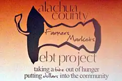 In late 2010, FOG launched its Alachua County Farmers Markets EBT Project. EBT, or Electronic Benefit Transfer, cards are given by the government to members of the federal Supplemental Nutrition Assistance Program for the purpose of purchasing food and non-alcoholic beverages. Before the launch of FOG's EBT Project, there were not many places in Alachua county for people with these federal food benefits to purchase groceries besides standard supermarkets. FOG wanted to implement a method for those with food assistance to purchase fresh, local merchandise at Alachua county farmers' markets. As a result of FOG's EBT program, EBT cards can now be swiped at a FOG vendor booth stationed at various farmers markets for tokens that can be used within the market to purchase meat, produce, and edible plants.[6] This project makes products at the farmers markets available to members of the food assistance program, offering these people more nutritious food options. In addition, the EBT project boosts the local economy by supporting Gainesville farmers and promotes local sustainable agriculture. The FOG booth is also an educational hub, offering resources on gardening, cooking, community events, and more.