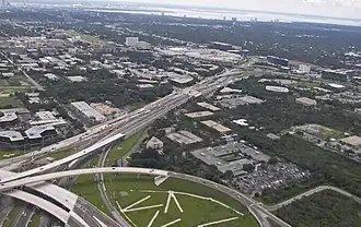 Throughout Clearwater, Gulf-to-Bay Boulevard serves as a long, straight west-to-east commercial strip, with notable intersections at Keene Road, later Belcher Road, and then Old Coachman Road and a power line crossing. The first interchange along the route is with US 19 which is the first Single-Point Urban Interchange in the United States. Another SPUI interchange follows with County Road 611, which consists of McMullen-Booth Boulevard and the Bayside Bridge. The last intersection in mainland Pinellas County is South Bayshore Drive, before the road becomes the Courtney Campbell Causeway over Tampa Bay to Memorial Highway, the eastern terminus of the causeway, and the southern terminus of SR 589 (Veterans Expressway) in Tampa. The road runs along a reverse J hook around Runway 19R of the Tampa International Airport[3] into the airport interchange which includes SR 616 (Spruce Street) to US 92 in Westshore, and the George L. Bean Parkway to the airport.