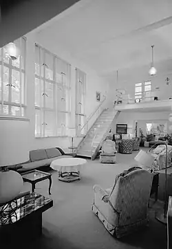 The house's interior was carried out by architects James S. Kuhne and Percival H. Goodman from Chicago and New York respectively.[1] The interior, painted in shades of yellow, coral, and blue,[11] was designed in the Modernist style—as was the rest of the house.[12] The central part of the interior features a living and dining room connected via an aluminum staircase to an overhanging balcony with access to the terrace.[5] The house's two bedrooms and the only bathroom, were located on the ground floor.[1]