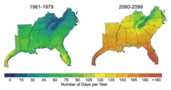 Southern Florida's mangroves are a tropical species that are limited to the tip of the Florida peninsula and the Florida Keys due to a climate preference. The upper portion of Florida falls into a sub-tropical climate hindering mangrove growth there due to cold weather events such as freezing. Twenty-eight years of satellite imagery has shown that mangroves have shifted their range northward in Florida in response to less harsh winters and less frequent cold events.[14] This is an issue apart from sea level rise which will cause mangroves to move inland even though both are caused by climate change.