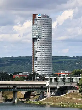 The building, which was constructed in 2001 according to designs by the architect Andreas Müller-Hartburg, is one of the tallest buildings in Vienna with a height of 113 meters. It has a usable area of around 36,000 m2 (388,000 sq ft), spread over 31 floors, and 9 elevators. The office complex features the main 30-story skyscraper along with a ground floor and a technology floor, three flat structures containing four or five stories each, and a three-story parking garage.[3] It has an energy-saving double-skin climate facade and opening windows, and cooling is achieved using chilled beams. At the end of 2006, the building was sold for 110 million euros to the German company DIFA Deutsche Immobilien Fonds AG, which now operates under the name Union Investment Real Estate AG.[4] The Florido Lounge is located on the 30th floor and can be rented for conferences and events for 10 to 240 people.[5]