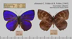 Flos chinensis, the Chinese plushblue, is a butterfly in the family Lycaenidae. It was described by Cajetan and Rudolf Felder in 1865. It is found in the Indomalayan realm (Sikkim, Bhutan, Assam, southwest China to Shanghai).[2]