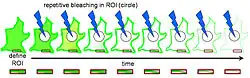 Before photobleaching can occur, cells must be injected with a fluorescent protein, often a green fluorescent protein (GFP), which will allow the targeted proteins to fluoresce and therefore be followed throughout the process. Then, a region of interest must be defined. This initial region of interest usually contains the whole cell or several cells. In FLIP, photobleaching occurs just outside the region of interest; therefore a photobleaching region also needs to be defined. A third region, the region where measurement will take place, needs to be determined as well. A number of initial scans need to be made to determine fluorescence before photobleaching. These scans will serve as the control scans, to which the photobleached scans will be compared later on. Photobleaching can then occur. Between each bleach pulse, it is necessary to allow time for recovery of fluorescent material. It is also important to take several scans of the region of interest immediately after each bleach pulse for further study.[1] The change in fluorescence at the region of interest can then be quantified in one of three ways. The most common is to choose the location, size and number of the regions of interest based on visual inspection of the image sets. The two other, rather new but more reliable approaches are either by detecting areas of different probe mobility on an individual image basis or by physical modeling of fluorescence loss from moving bodies.[2]