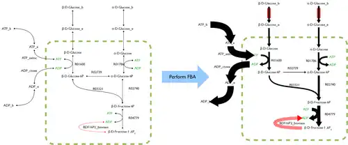 FBA finds applications in bioprocess engineering to systematically identify modifications to the metabolic networks of microbes used in fermentation processes that improve product yields of industrially important chemicals such as ethanol and succinic acid.[5] It has also been used for the identification of putative drug targets in cancer [6] and pathogens,[7] rational design of culture media,[8] and host–pathogen interactions.[9] The results of FBA can be visualized for smaller networks using flux maps similar to the image on the right, which illustrates the steady-state fluxes carried by reactions in glycolysis. The thickness of the arrows is proportional to the flux through the reaction.