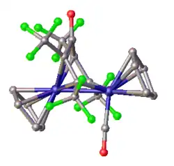 - ^ Davidson, John L.; Green, Michael; Stone, F. Gordon A.; Welch, Alan J. (1976). "Insertion Reactions of Hexafluorobut-2-yne, Tetrafluoroethylene, and Hexafluoroacetone with η5-Cyclopentadienyl-Iron, -Ruthenium, -Palladium, and -Molybdenum Complexes; Molecular and Crystal Structures of [Fe2(CO){C4(CF3)4CO}(η5-C5H5)2] and [Fe{COCF2C5H5}(η5-C5H5)]". J. Chem. Soc., Dalton Trans. (20): 2044–2053. doi:10.1039/dt9760002044.