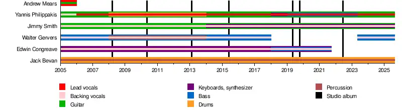 Foals (stylised in all caps) are a British rock band formed in Oxford in 2005. The band's current line-up consists of Greek-born lead vocalist and guitarist Yannis Philippakis, drummer and percussionist Jack Bevan, guitarist and keyboardist Jimmy Smith and bassist Walter Gervers.