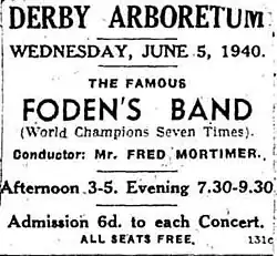 Conductor Fred Mortimer (1880–1953) led Fodens for 27 years from around 1927 until his death in 1953. During that time they won the national championships eight times, and according to Mortimer, had been broadcast around 250 times.[6]