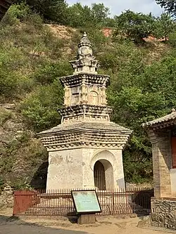The Zushi Pagoda (祖师塔), is a small funerary pagoda located to the south of the Great East Hall. While it is unclear as to the exact date of its construction, it was either built during the Northern Wei dynasty (386–534) or Northern Qi dynasty (550–577) and possibly contains the tomb of the founder of the Foguang Temple.[23] It is a white, hexagonal shaped 6-metre (20 ft) tall pagoda. The first storey of the pagoda has a hexagonal chamber, while the second storey is purely decorative. The pagoda is decorated with lotus petals and the steeple supports a precious bottle in the shape of a flower.[24]
