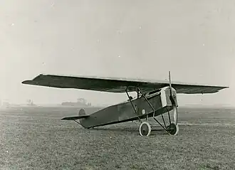 In 1921, the US Army Air Service evaluated the Fokker D.VIII parasol monoplane, and the D.VII biplane, both fighters handed over to it after the Armistice with Germany that ended World War I. It placed an order for two examples of a parasol monoplane fighter based on the design of the D.VIII, but powered by an American-built Hispano-Suiza V-8 engine, for evaluation.[1] These aircraft, designated by Fokker as Fokker F VI,[nb 1] had plywood-covered wooden cantilever wings similar to those in the D.VIII and the contemporary D.X fighters, and a typical Fokker welded steel-tube fuselage. The forward fuselage was protected by armour plates, although the car-type radiator and the wing-mounted fuel tank had no such protection. The aircraft had a fixed tailskid undercarriage, while it had no fixed fin, having a balanced rudder instead.[3][4]
