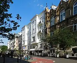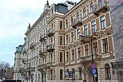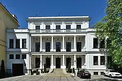 The park continued to change hands and eventually disappeared over the course of the 19th century.[11] Under the Przeździecki family, the property was partitioned, the former park alley was transformed into a street, and individual plots of land were sold.[12] Between 1875 and 1877, Konstanty Zamoyski erected an imposing Renaissance Revival mansion at its far end.[13] Designed by renowned Polish-Italian architect Leandro Marconi, the building survived to this day.[13] Another extant historical edifice is the Przeździecki Palace with its two-storey arcaded colonnade, located at Foksal 6.[14] It was rebuilt in its current Neo-Renaissance form between 1951 and 1953.[15] Simultaneously, many city-style tenements and urban architecture began appearing close to the intersection with Nowy Świat.[16] The Neo-Gothic house at Foksal 19 and Teatr Sabat at Foksal 16 are notable landmarks.[17]