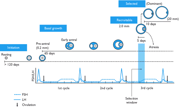 These two steps, while not part of folliculogenesis, are included for completeness. They are discussed in their entirety by their respective articles, and placed into perspective by the menstrual cycle article. It is recommended that these three topics be reviewed.