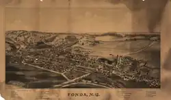 The village of Fonda developed near the site of the former Mohawk village of Caughnawaga, also known as Kanatsiohareke. Here the Mohawk had cultivated corn in the floodplain on the north side of the Mohawk River.
