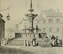 The fountain was commissioned in 1212 by the commune. The design and construction is attributed to the stonemasons, Pietro and Bertoldo di Giovanni, whose names appear in an epigraph placed on the lower basin of the fountain. The fountain replaced a fountain known as Fontem Sepalis (referring to flowerlike shape and documented in the Liber Censum of 1192). The Greek cross layout of the lower basin, as well as the central pillar on which two cups are stacked and topped by a finial, are due to refurbishments over the centuries including in 1279 and 1424. The four lion heads, symbols of Viterbo, were added in 1424. The pyramidal finial structures date to 1827 and were executed by architect Domenico Lucchi.[1] The fountain was originally fed by a Roman aqueduct that entered the city near the church of San Sisto; construction of this aqueduct was attributed to the 1st century consul Mummio Nigro Valerio Vigeto to bring water to his Villa Calvisiana.[2]