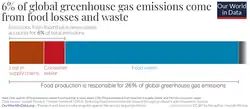 Food loss and waste is a major part of the impact of agriculture on climate change (it amounts to 3.3 billion tons of CO2e emissions annually[5][6]) and other environmental issues, such as land use, water use and loss of biodiversity. Prevention of food waste is the highest priority, and when prevention is not possible, the food waste hierarchy ranks the food waste treatment options from preferred to least preferred based on their negative environmental impacts.[7] Reuse pathways of surplus food intended for human consumption, such as food donation, is the next best strategy after prevention, followed by animal feed, recycling of nutrients and energy followed by the least preferred option, landfill, which is a major source of the greenhouse gas methane.[8] Other considerations include unreclaimed phosphorus in food waste leading to further phosphate mining. Moreover, reducing food waste in all parts of the food system is an important part of reducing the environmental impact of agriculture, by reducing the total amount of water, land, and other resources used.