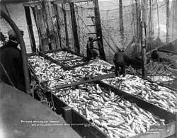 They are small fish that return in enormous schools to spawn near the mouths of freshwater rivers and streams. Herring are traditionally harvested with herring rakes, long poles with spikes that are swirled around in the schooling fish. An experienced herring raker can bring up ten or more fish with each swing, and deftly flick the fish from the rake into the bottom of the boat. Raking can be enhanced with pens, weirs, and other techniques of condensing the large schools. More modern methods usually involve small aperture nets and purse seining. Herring are usually processed like salmon, dried and smoked whole. Cleaning and removal of the viscera is optional, and if being frozen whole many do not bother due to the diminutive size of the fish. They are traditionally stored by submerging in seal oil (the "Tlingit refrigerator"), but in modern times may be canned, salted, or frozen, the latter usually in vacuum-sealed bags.