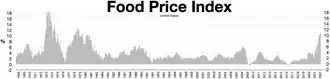 It is rare for price spikes to hit all major foods in most countries at once, but food prices suffered all-time peaks in 2008 and 2011, posting a 15% and 12% deflated increase year-over-year, representing prices higher than any data collected.[38] One reason for the increase in food prices may be the increase in oil prices at the same time.[39][40]