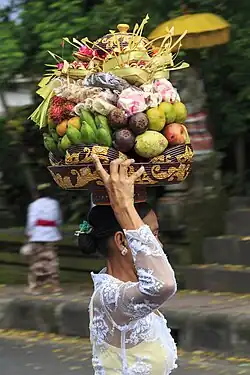 The importance of rice in Indonesian culture is demonstrated through the reverence of Dewi Sri, the rice goddess of ancient Java and Bali.[21] Traditionally, the agricultural cycles linked to rice cultivation were celebrated through rituals, such as Sundanese Seren Taun or the "rice harvest festival." In Bali, the traditional subak irrigation system was created to ensure that there is adequate water supply for rice paddies. The irrigation system was managed by priests and created around "water temples".[19][22] Indonesian vernacular architecture also recognizes numbers of lumbung or rice barns styles, such as Sundanese leuit, Sasak style rice barn, Toraja's tongkonan shape, to Minangkabau's rangkiang.[23] Rice-growing shapes the landscape, is sold at markets, and is served in most meals.[22][24]