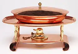 When used domestically, such as with fondue, a food warmer may simply be a small vessel containing food upon a trivet which contains a heat source such as a flame or electric element.
