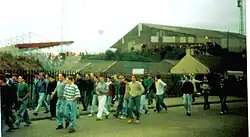 Whilst all this was happening the HBC had arrived in Oldham and ended up fighting with the FYC mob that proved to be too strong for the Hibs youngsters. The Oldham boys thought that was it for the day until the remainder of the CCS turned up belatedly due to their earlier exertions. When it was discovered what had happened prior to their arrival the Hibs mob anger was tangible enough for the police to attempt to contain them within the away terracing. This section of the ground was enclosed by a series of metal pens and the police tried to lock the gates on them but were met by resistance from the Hibs boys throughout the game. Eventually the police abandoned this plan and then relied upon securing the huge wooden gates at the perimeter of the stadium. Even this didn't stop the rampant CCS who after the final whistle managed to crash open this last obstacle between them and the FYC. The raging Hibs mob quickly overcame the police lines outside the ground and steamed into Oldham's mob.[8]