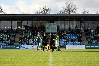 The stadium also hosts association football and hosted a Hampshire Cup match in 2010 with Guernsey side Guernsey Rangers defeating Hamble 4–2.[7] It is the home ground of Guernsey who play in the Isthmian League Division 1 South.[8] The team's first competitive match against Knaphill F.C. ended in a 5–0 win to Guernsey.[9] In addition, the ground from 2003 to 2009 hosted Guernsey's Muratti games before the future games were moved to The Track due to fans complaining that the presence of the athletics track between the grandstands and the pitch put the spectators too far away from the game action. It is also noted that Guernsey did not win a single Muratti while playing at Footes Lane.[10]