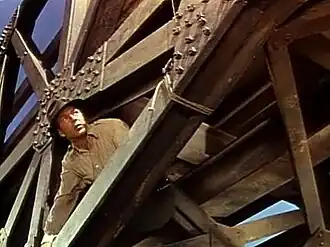 While the guerrilla fighters—Pablo, Pilar, and María—create a diversion for Jordan and Anselmo, the two men plant and detonate the dynamite, costing Anselmo his life when he is hit by a piece of debris from the falling bridge. While the guerrillas are escaping on horseback, Jordan is maimed when a fascist tank shoots his horse out from under him. Jordan cannot feel his legs and he knows that if his comrades stop to rescue him, they too will be captured or killed. He bids goodbye to María and ensures that she escapes to safety with the surviving guerrillas. Armed with a Lewis machine gun, he waits until the horse-mounted fascist soldiers appear in his gun sights. He then pulls the trigger, firing a sweeping barrage at the oncoming soldiers. The film ends with Jordan firing the Lewis gun directly at the camera.