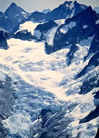 Forbidden Glacier is on the north slopes of Forbidden Peak, North Cascades National Park in the U.S. state of Washington.[2] The glacier is approximately .75 mi (1.21 km) in length, 1 mi (1.6 km) in width at its terminus and descends from 8,000 to 5,600 ft (2,400 to 1,700 m). The glacier is separated by an arête from Boston Glacier to the east and south. Meltwaters from Forbidden Glacier flow into Moraine Lake.