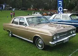 The 1964 US Fairlane 500 sedan was assembled by Ford Australia from December 1963 as the FD model.[12] It was introduced in April 1964, distinguished by a lack of tail fins[10] and a new grille with seven vertical bars.[13] A choice of two powertrains was offered in the new model, a 260-cubic-inch (4.3 L) Windsor V8 with Ford-O-Matic automatic transmission or a 289-cubic-inch (4.74 L) Windsor V8 with Cruise-O-Matic automatic transmission.[10] The 1964 model was the last of the US Fairlanes in Australia, as Ford discontinued the model locally in 1965 to make way for the larger Ford Galaxie;[10] 1,344 examples were produced in Australia.[9]